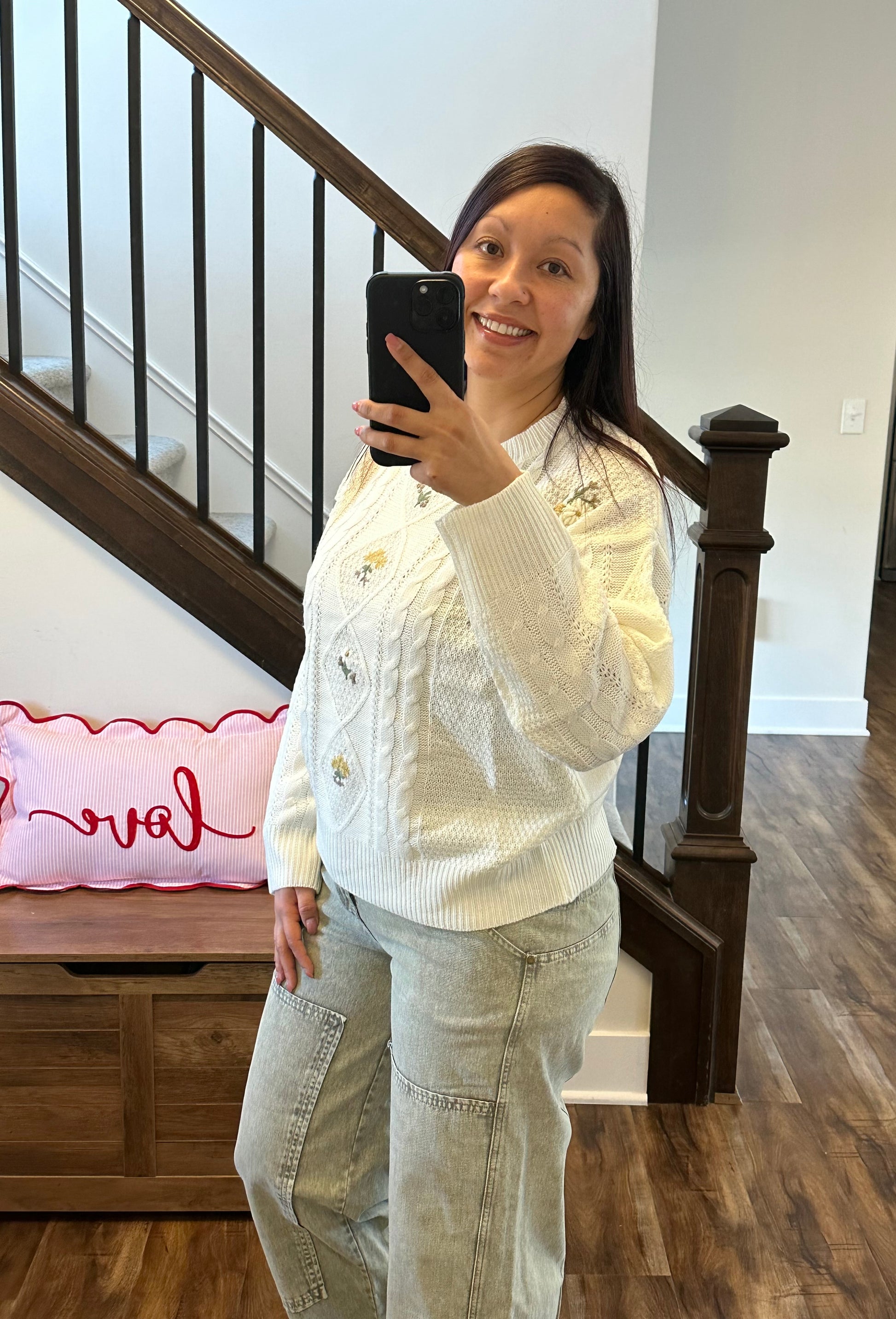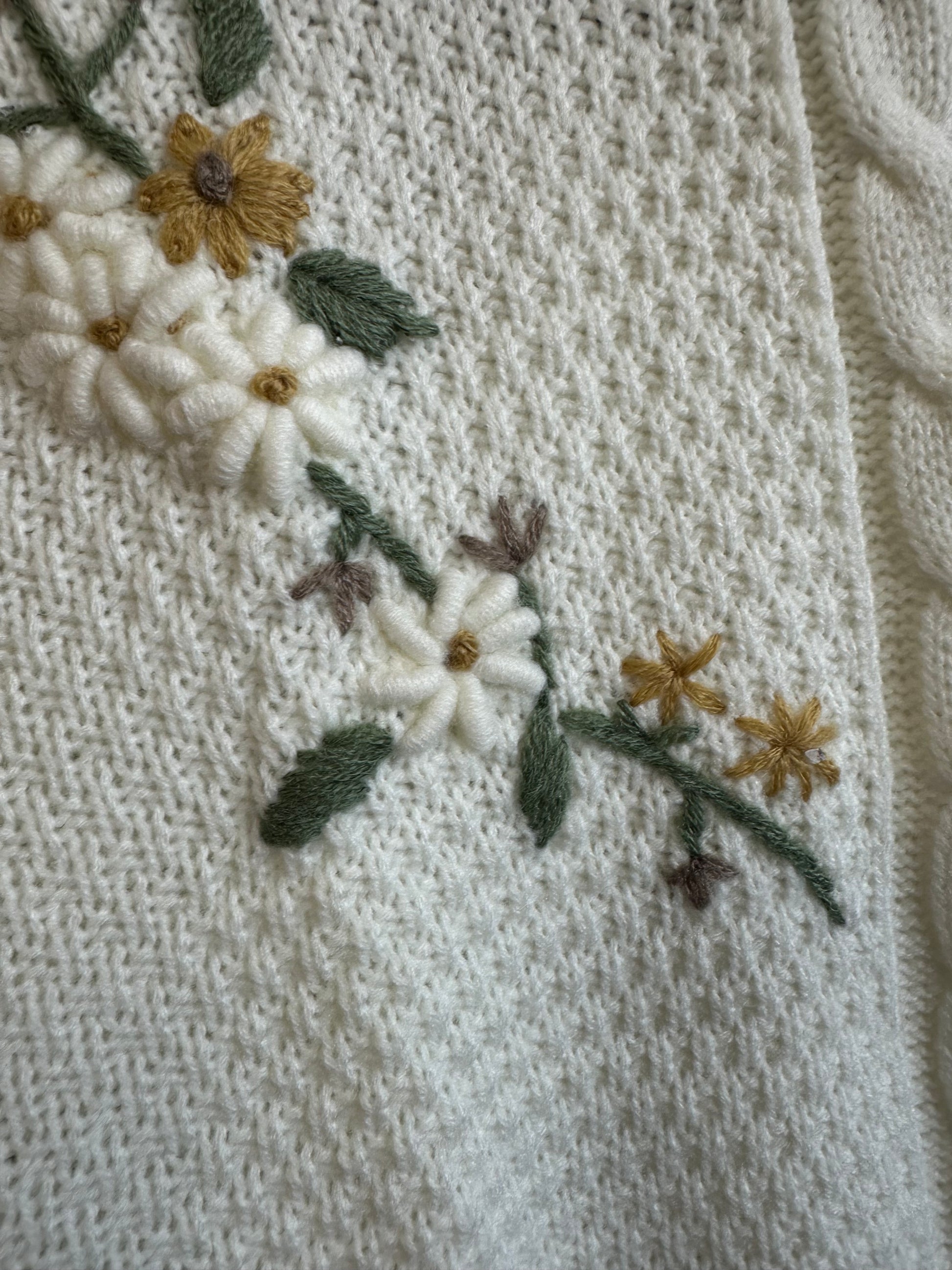 ๐ŸŒผThe Blossom & Braided Sweater is the perfect blend of cozy texture and sweet detail. โœจ This ivory cable knit sweater features delicate embroidered flowers in mustard yellow and white ๐ŸŒผ๐Ÿค, accented with earthy brown and green stems ๐ŸŒฟ๐ŸคŽ for a soft, romantic touch.
